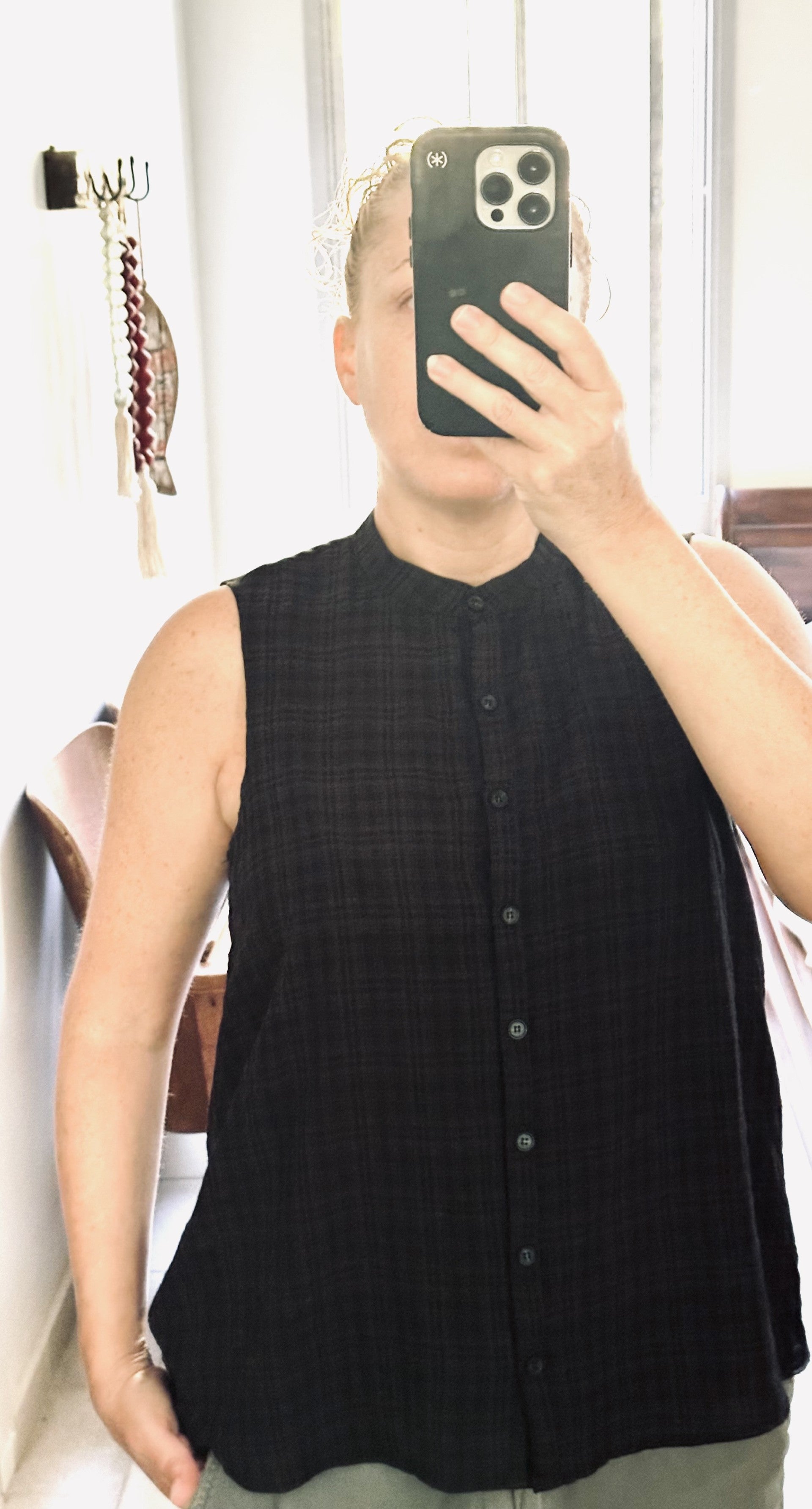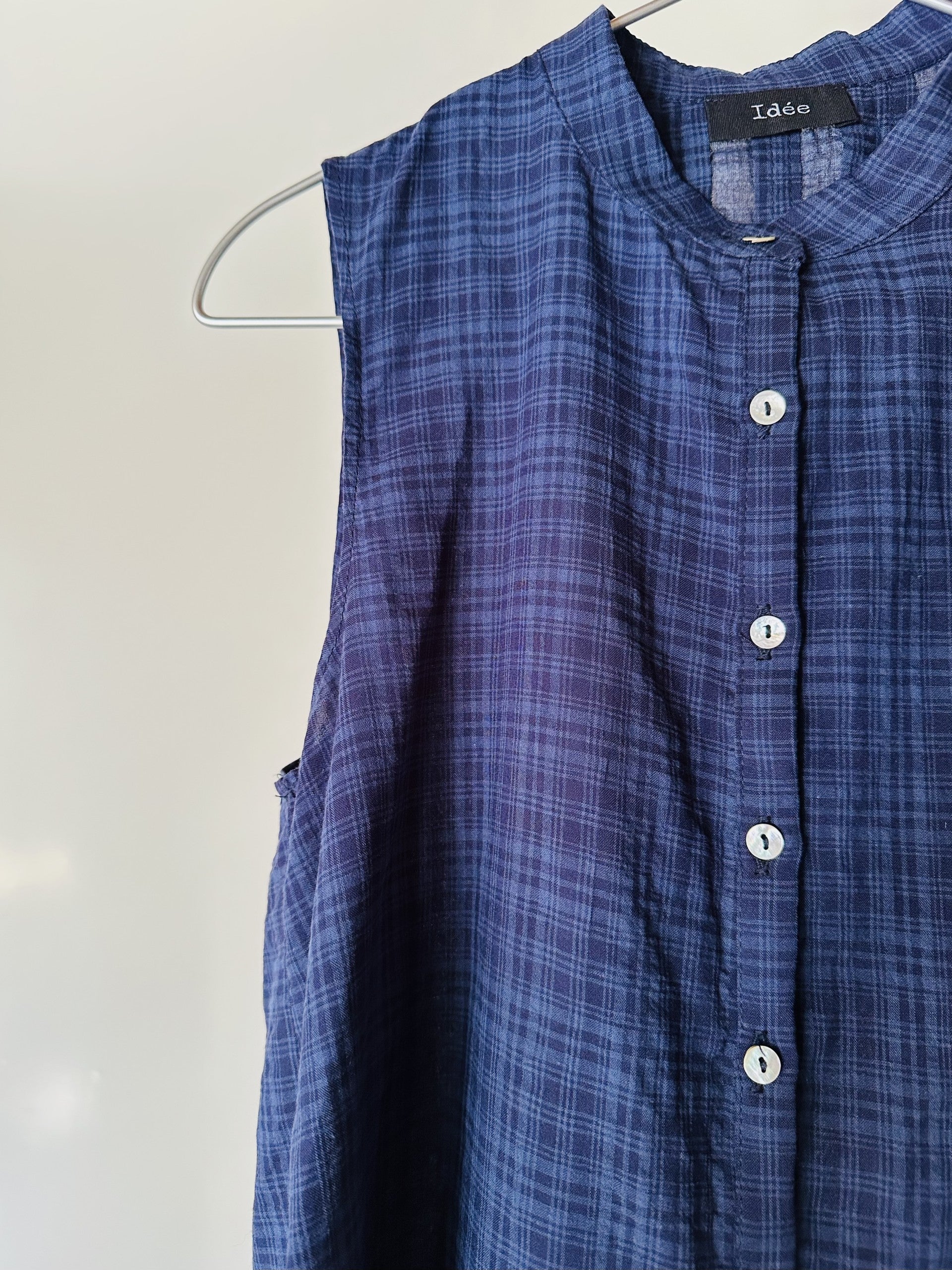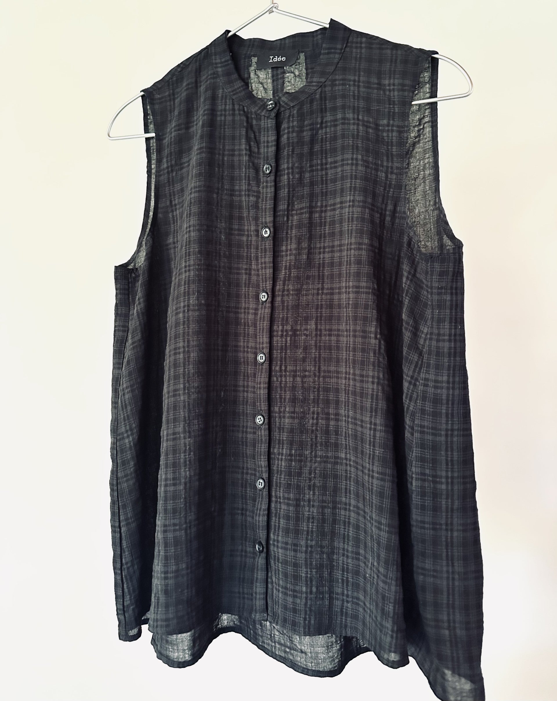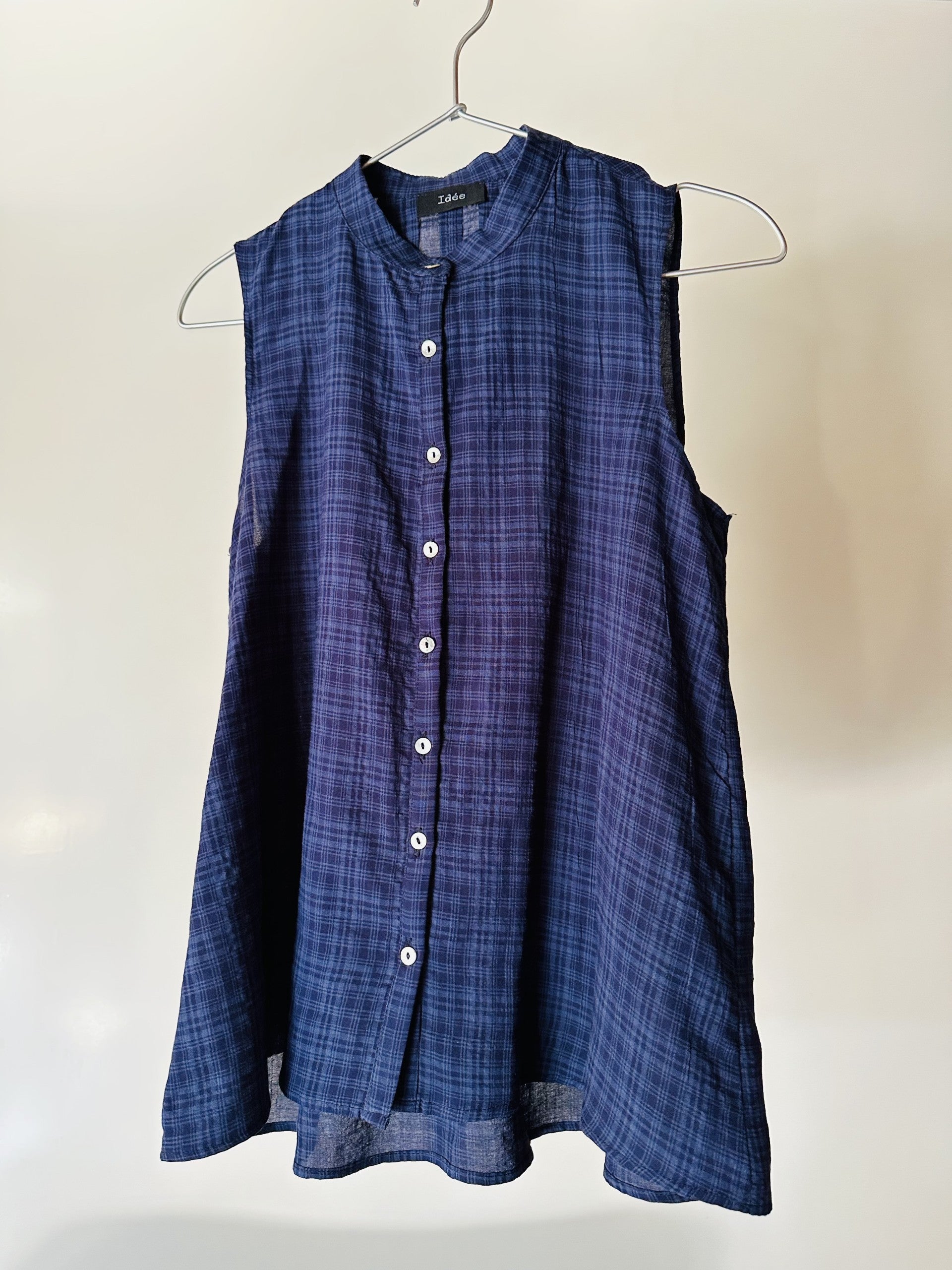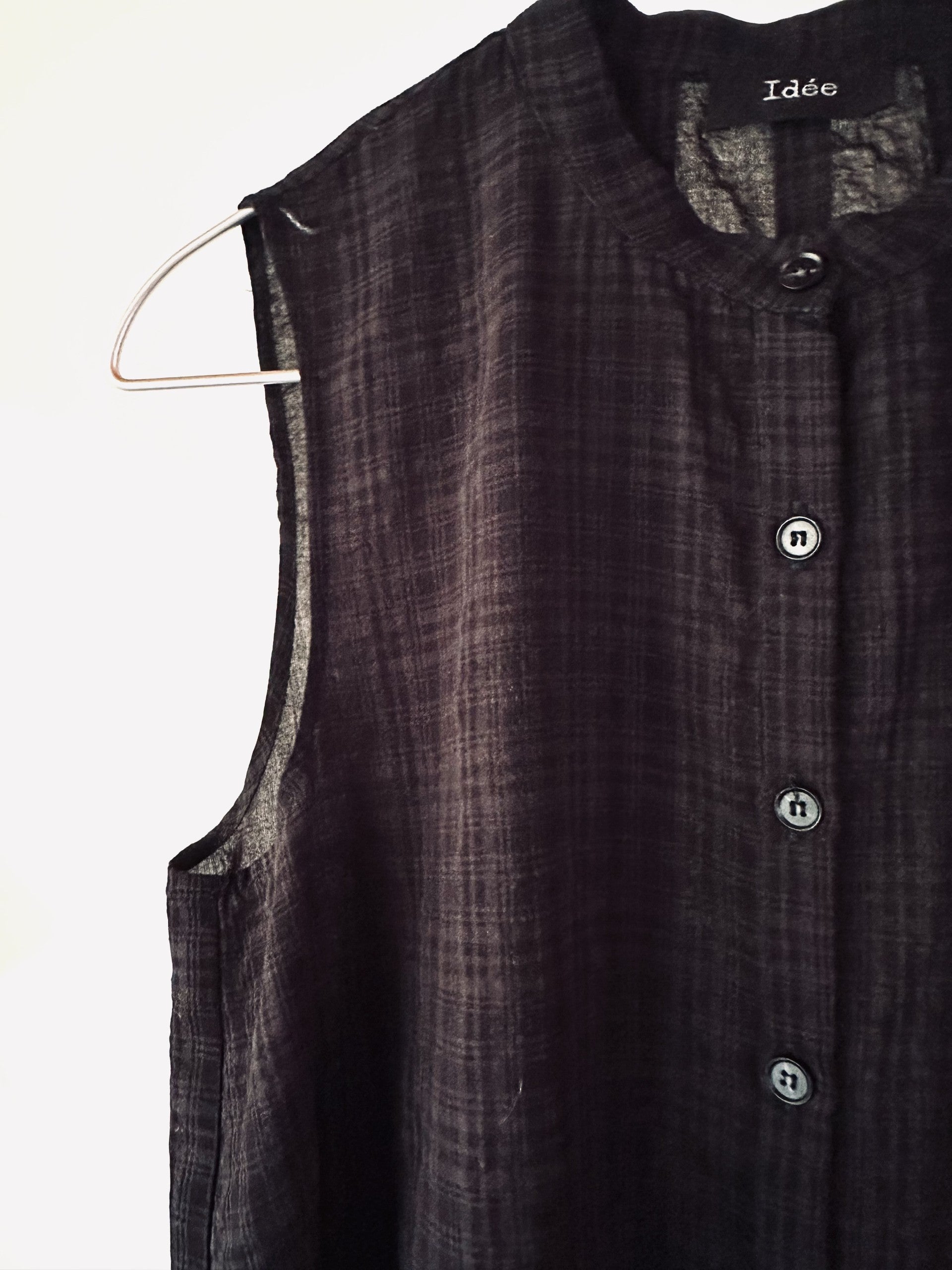 - A sleeveless blouse featuring a clean, poetic silhouette with a refined mandarin collar and a row of buttons down in the front.