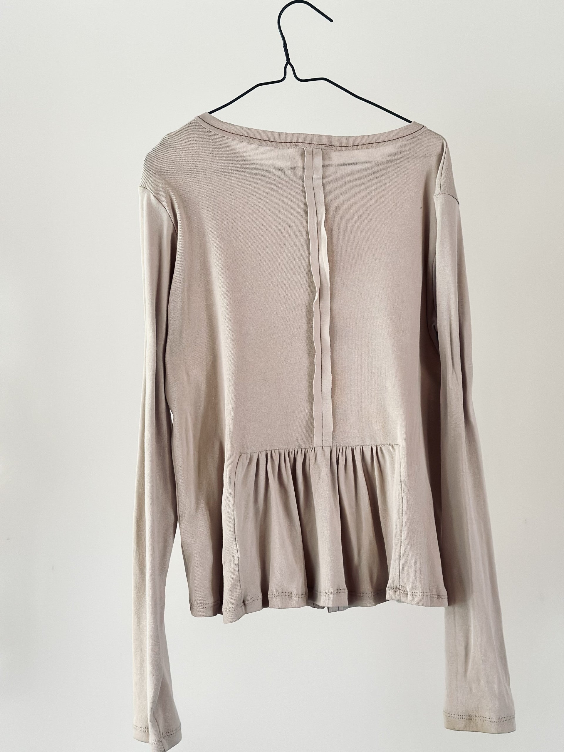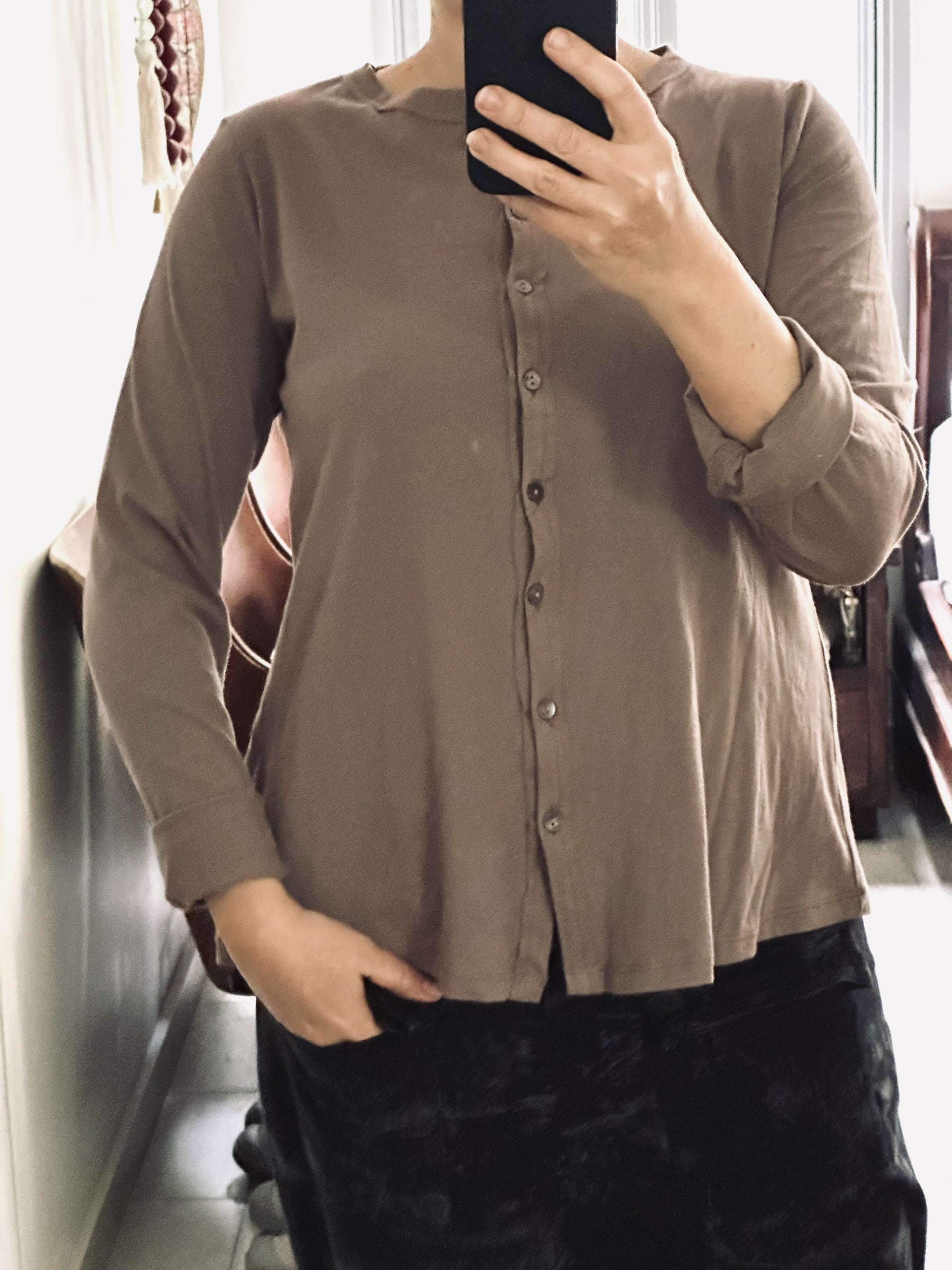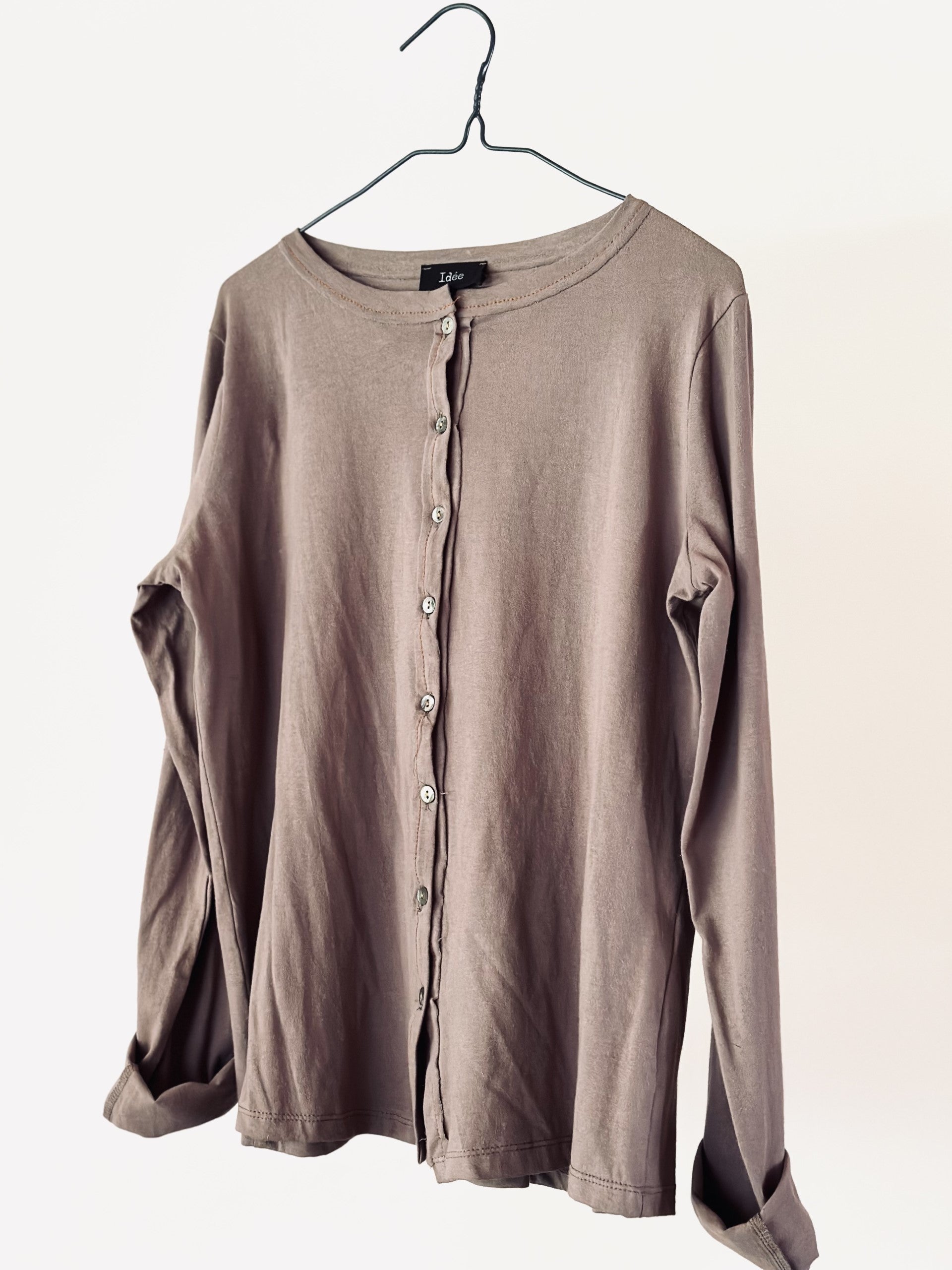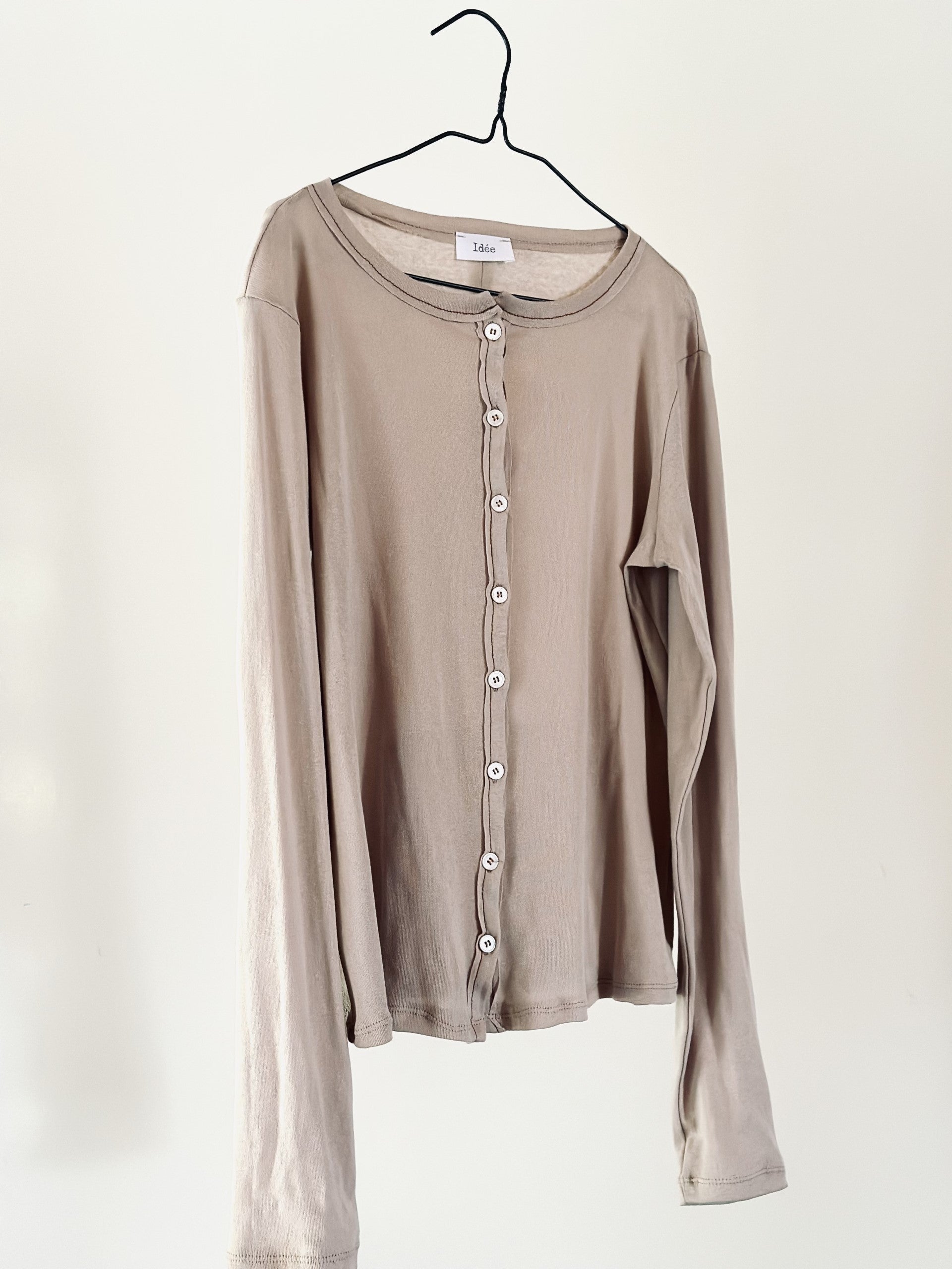 The ultimate cardigan, soft ease shape, can be worn as is or on top of a tank top, made from washed, natural ,soft knit.