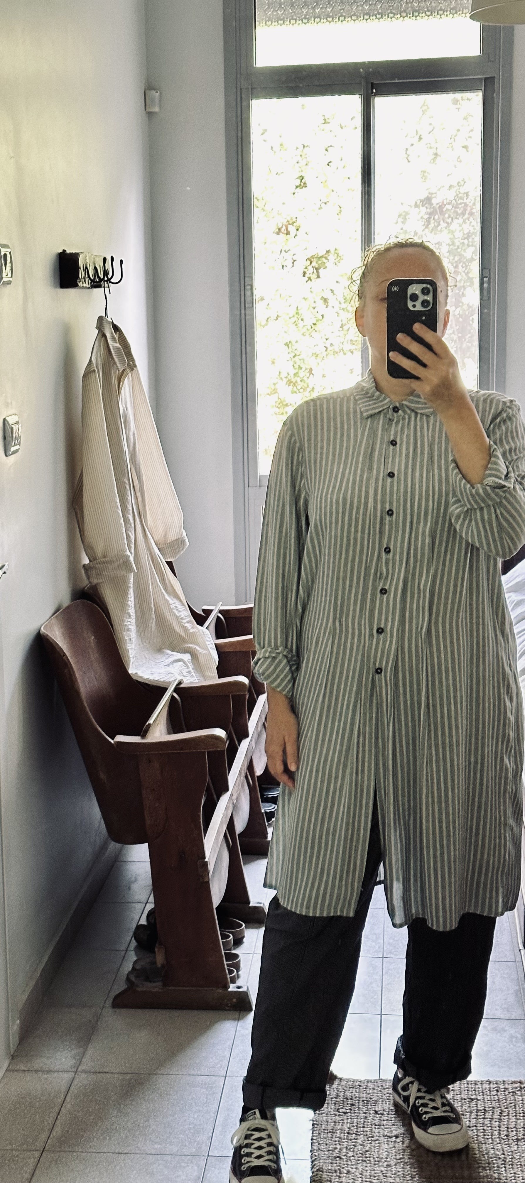 - Fit and style: Flowing A-Line silhouette, soft pleats stitched along the front with emphasized seems, full front buttoned closure, versatile length that allows it to be worn as a dress or as a long tunic-style shirt.