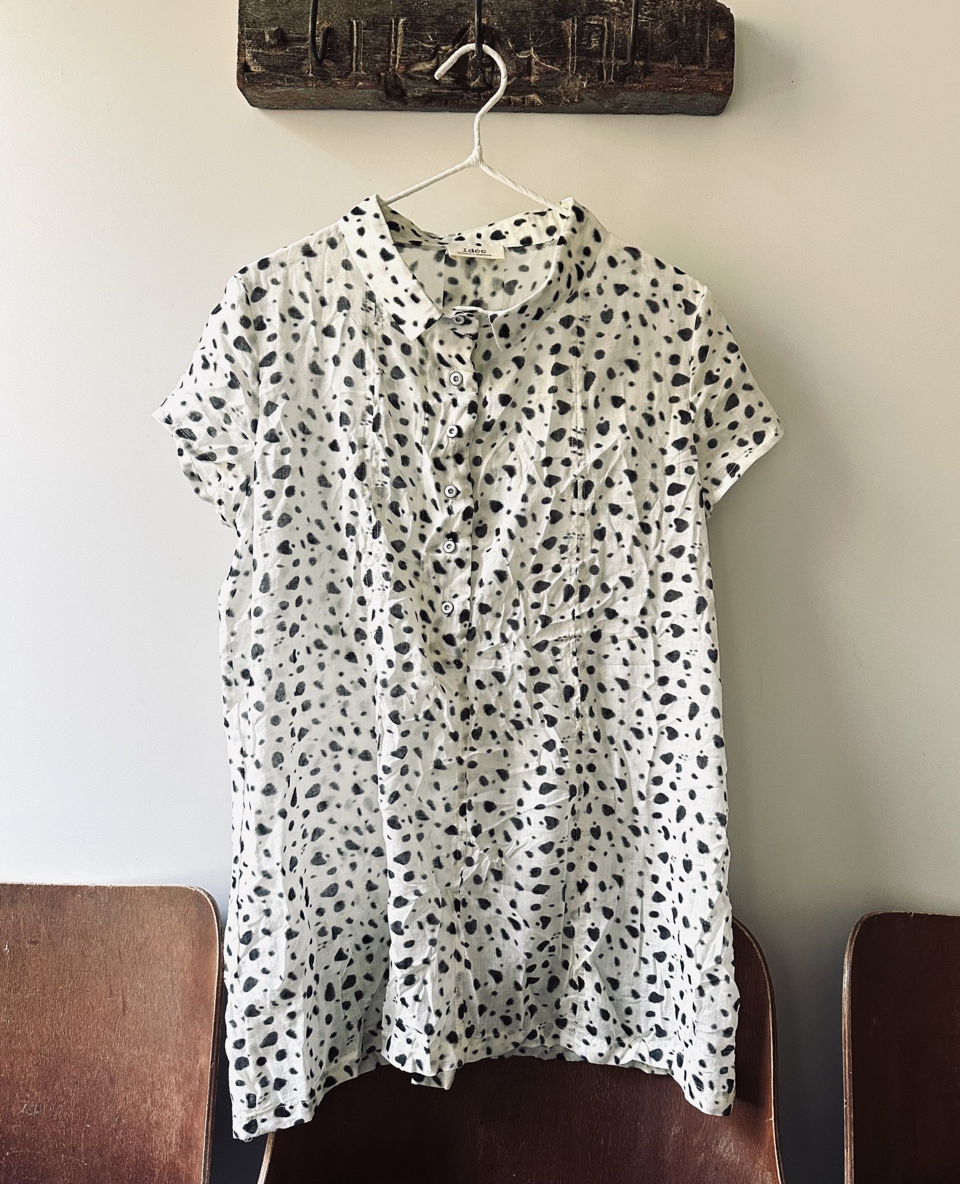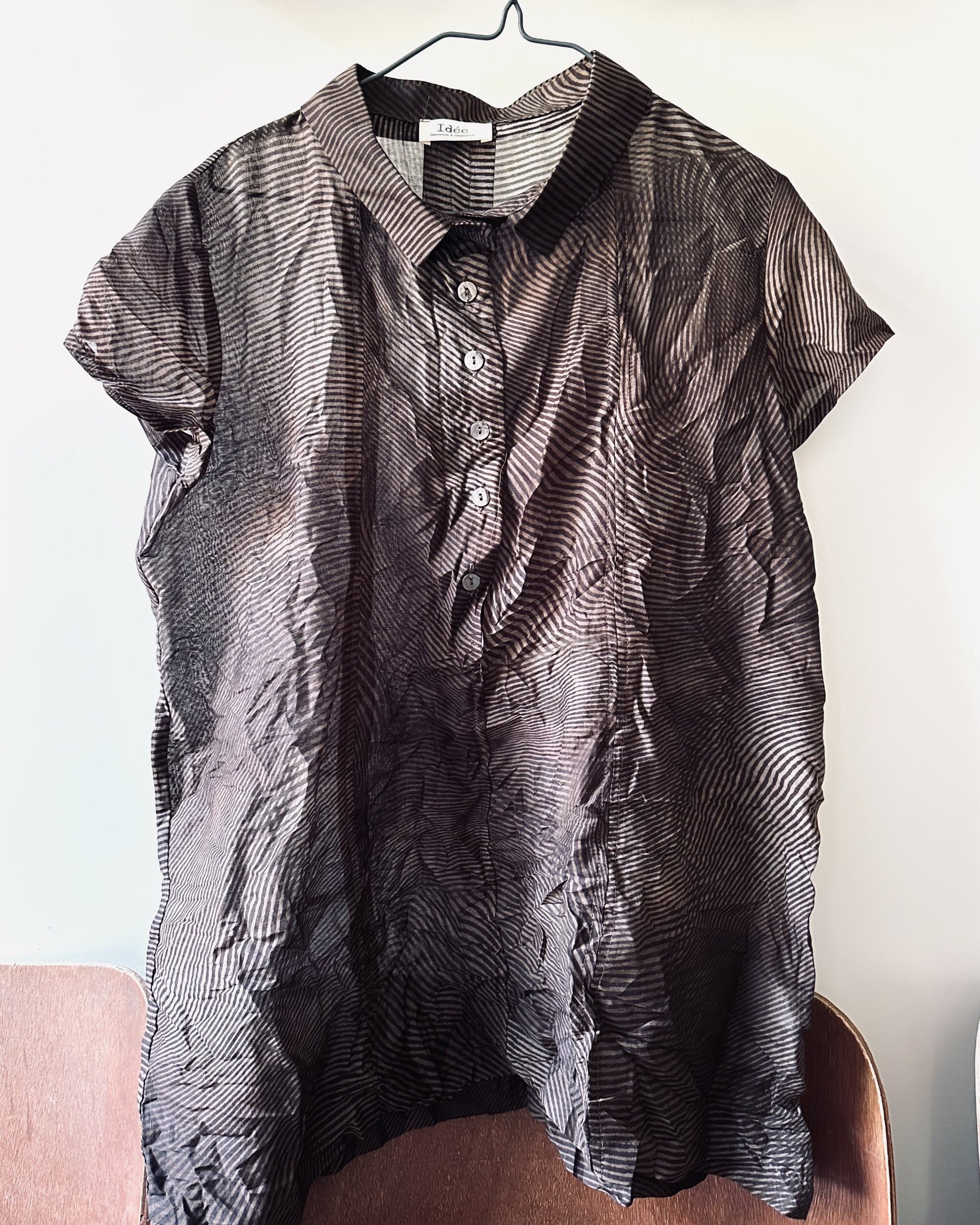 - A refined tunic silhouette with clean cuts and structured masculine -inspired collar.