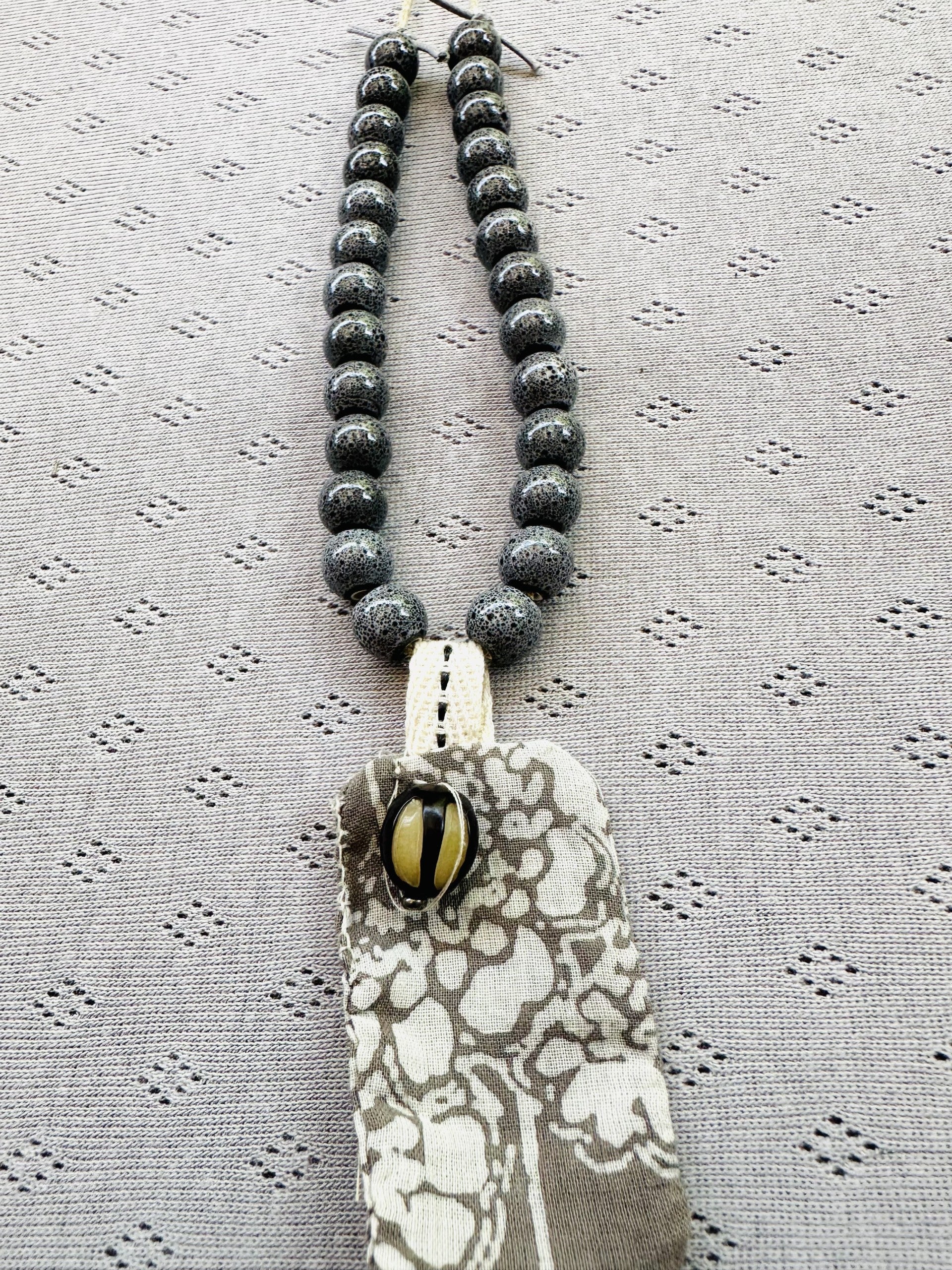 - A hand-cut fabric disk sits behind the focal bead, adding dimension ,texture and a poetic detail in my unmistakable language.
