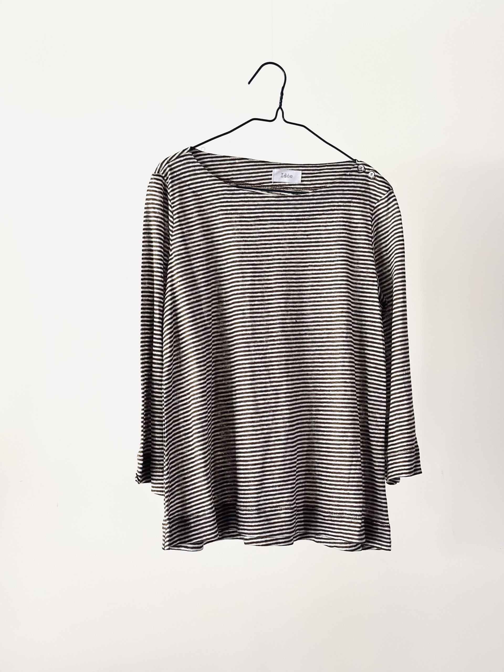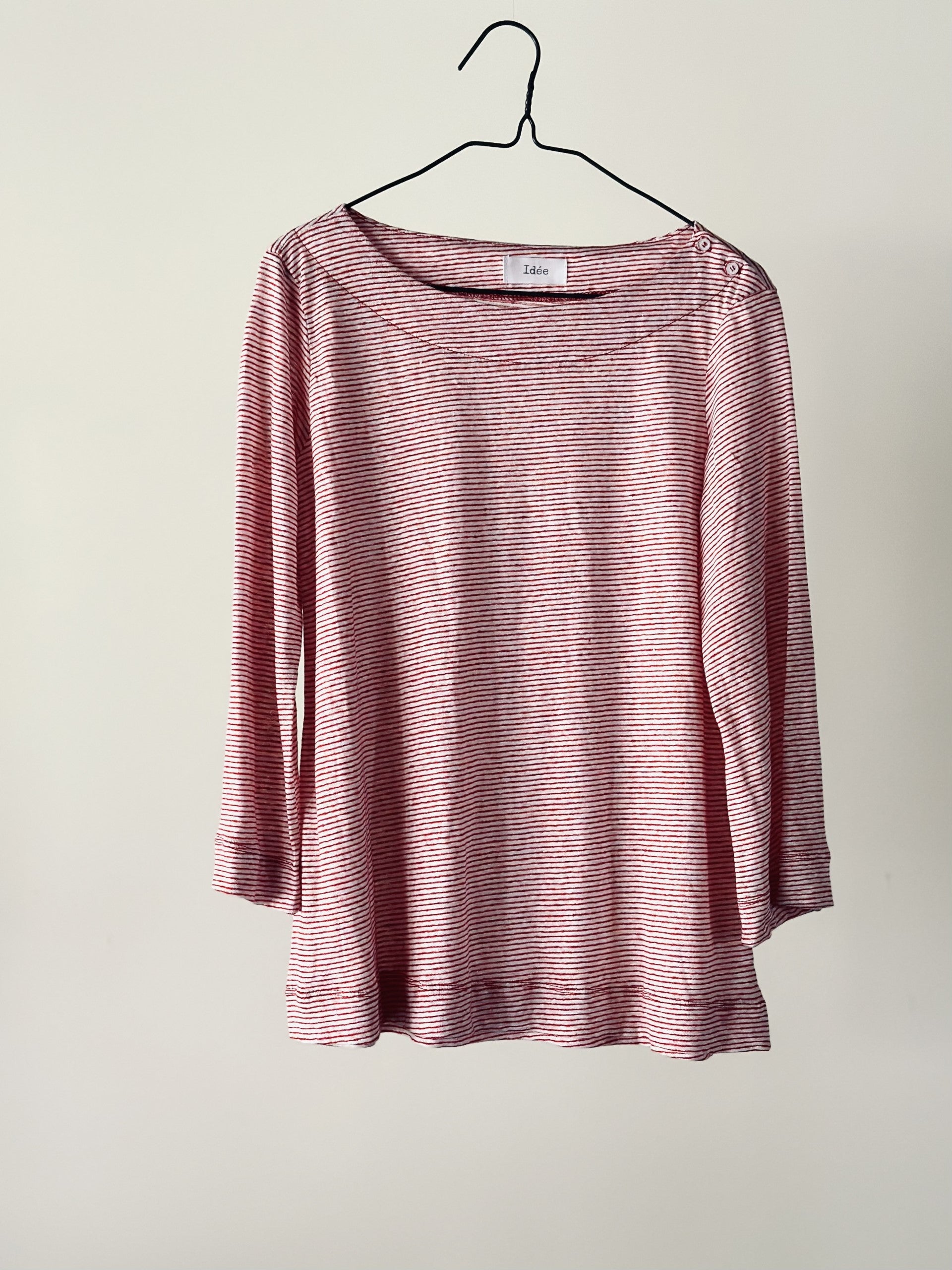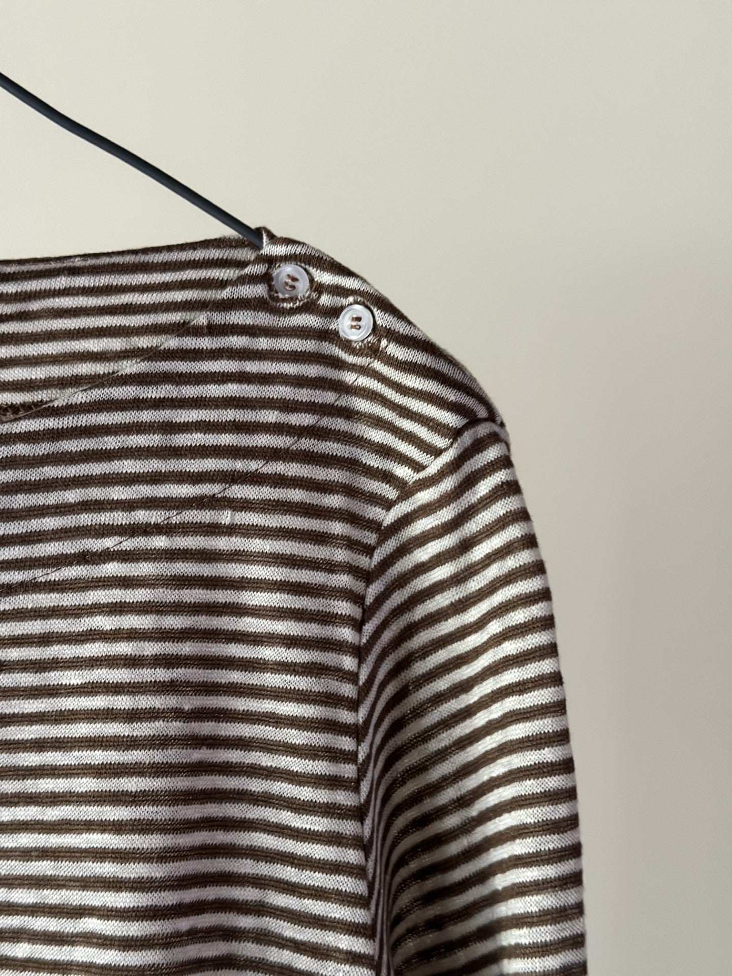 - קו צוואר בגיזרת סירה מכופתר בכתף בשני כפתורים.