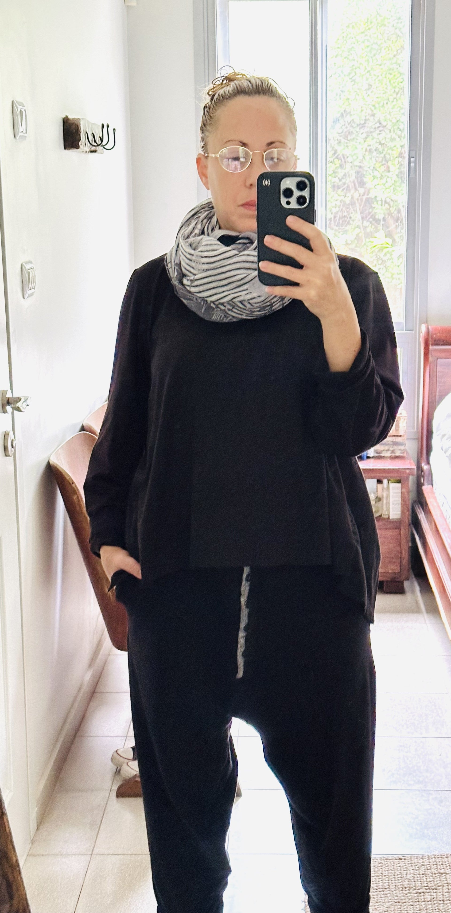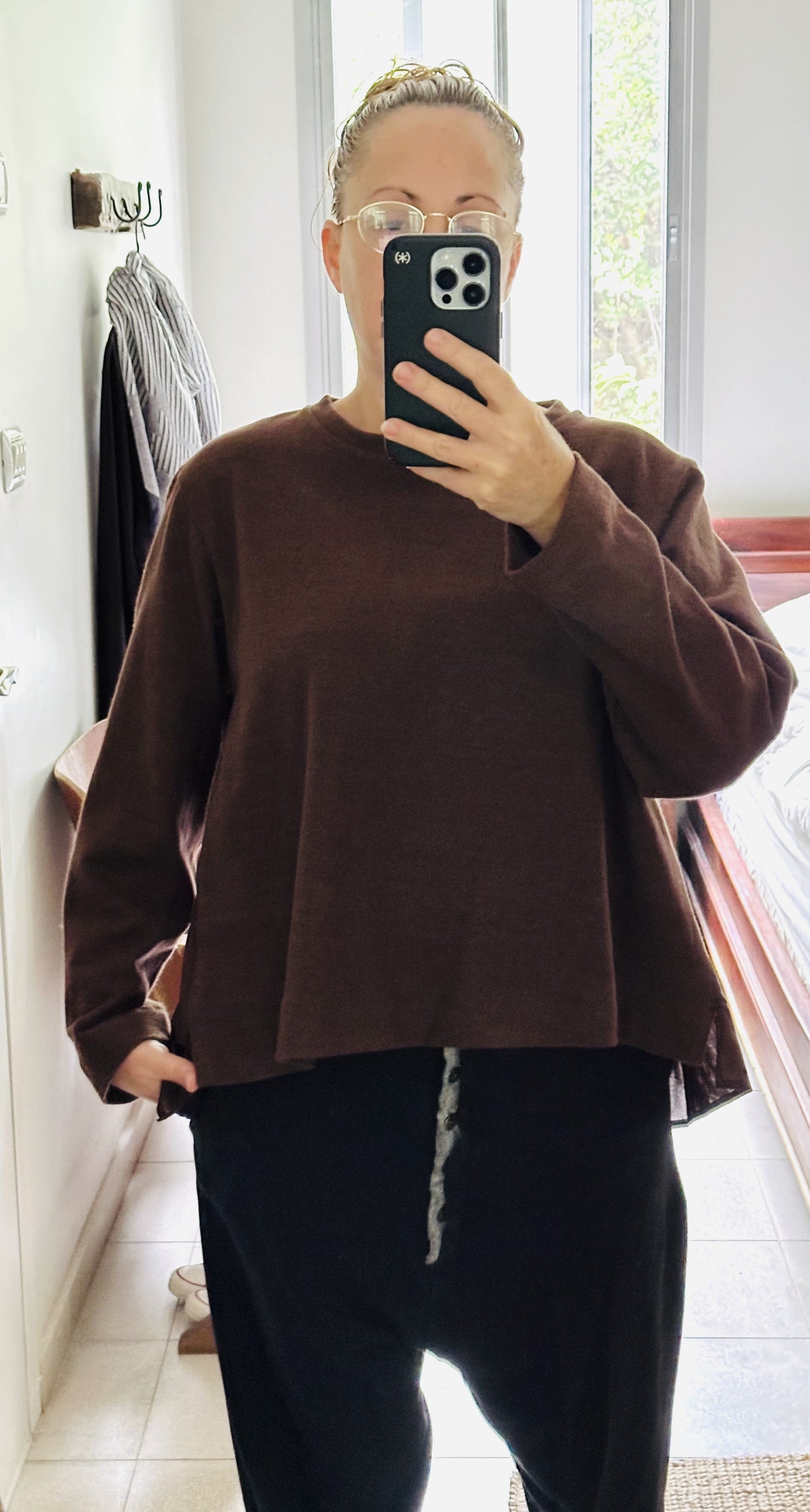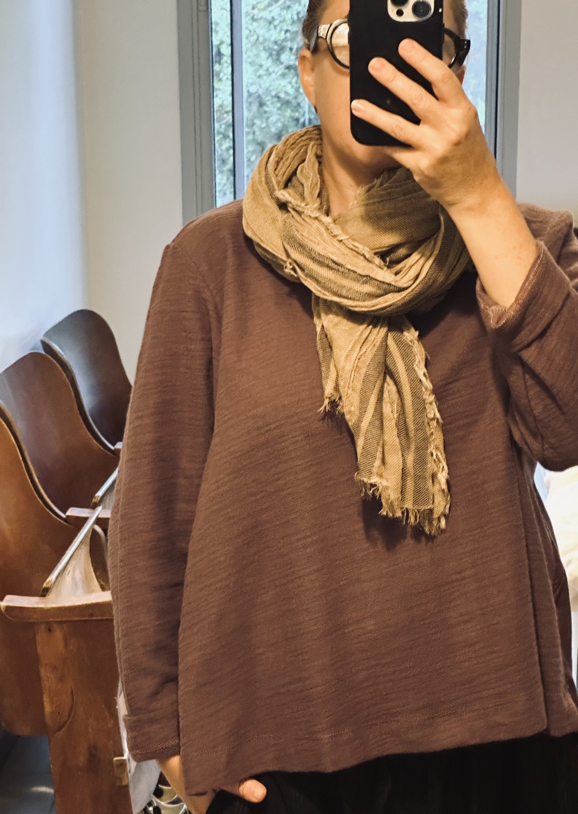 פריט מחבק ועם זאת מתוחכם ומוקפד, חולצה ייחודית זאת משלבת סריג כותנה רך עם גב כותנה ארוג, הכולל שורה של קפלים עדינים היוצרים נפח ותנועה עשוי סריג חמים ונעים במיוחד.