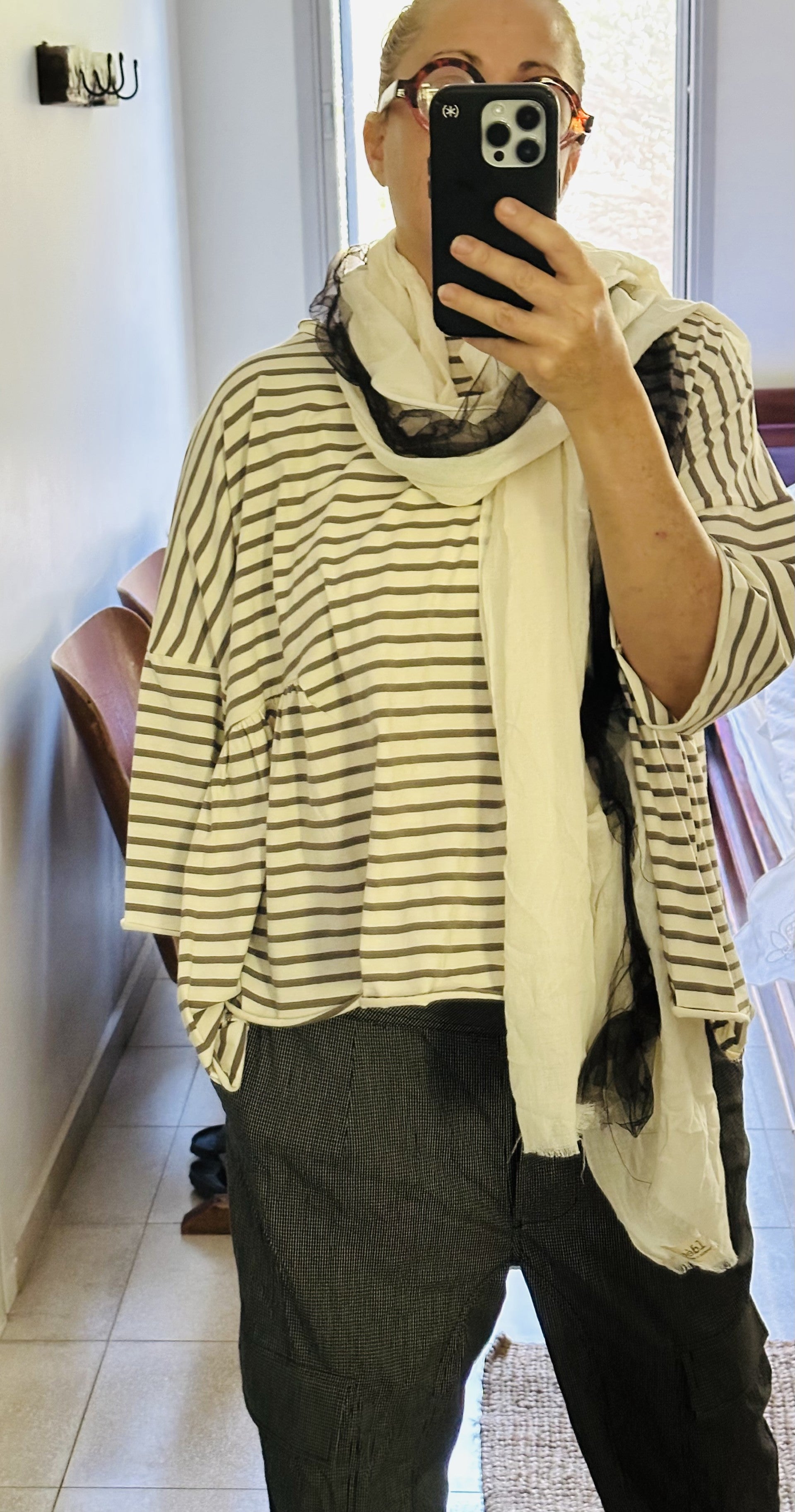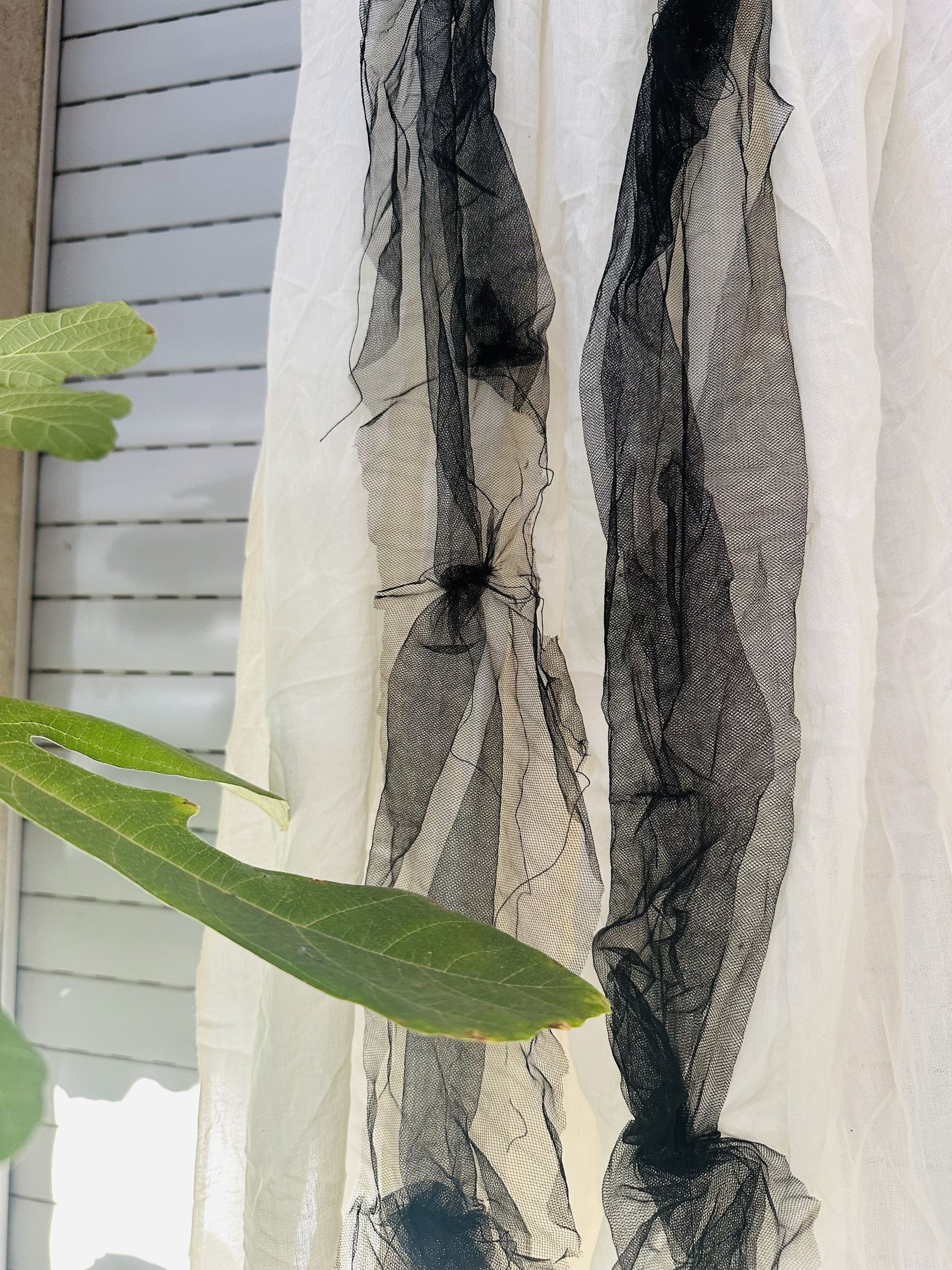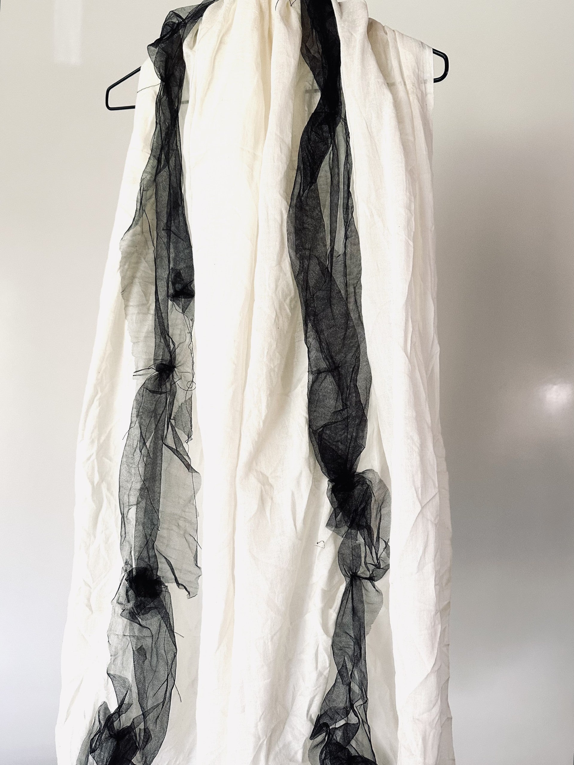 אביזר עדין ופיוטי שמשדרג כל מראה, צעיף בצבע לבן-שמנת עשוי מ-100% ויסקוזה, מושלם לעונות מעבר או ללבישה בשכבות כל השנה, הפרט הייחודי מוסיף נופך גרפי ואמנותי.